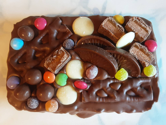 Our Belgian Milk Chocolate Flapjack Slab with Chocolate and Jelly Sweets consists of a slab of our Homemade Flapjack. The slab, which measures approximately 17cm x 11.50cm, is covered with Belgian Milk Chocolate and then topped with an assortment of sweets which could include Maltesers, Mars Bar, Milkybar Buttons, Smarties, Jelly Tots, Curly Wurly to name a few! The finished product may differ slightly from the photograph as it will be freshly made to order just for you.